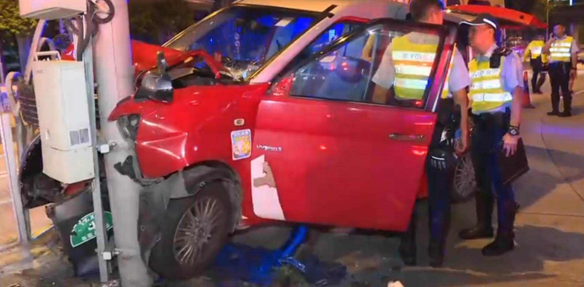 新蒲崗73歲的士司機疑駕駛時暈倒 撞欄撼燈柱昏迷,女乘客受傷。(有線電視新聞截圖)