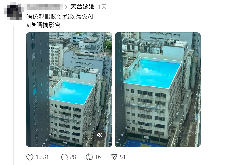 天氣仍然炎熱,有網民近日在社交平台Threads以「天台泳池」為題,上載新蒲崗一工廠大廈的天台,疑出現無邊際的「泳池」,天台範圍注滿一池蔚藍的水,樓主指現場為「六合街」,稱「唔係親眼睇到都以為係AI(人工智能)#啱晒搞影會」。
