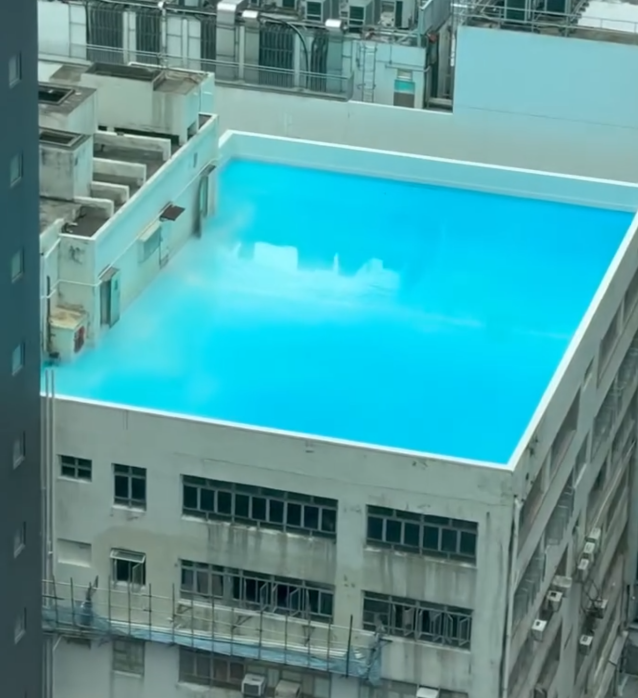 有網民在社交平台Threads以「天台泳池」為題,上載新蒲崗一工廠大廈的天台,疑出現無邊際的「泳池」,天台範圍注滿一池蔚藍的水,帖文引發網民熱議,