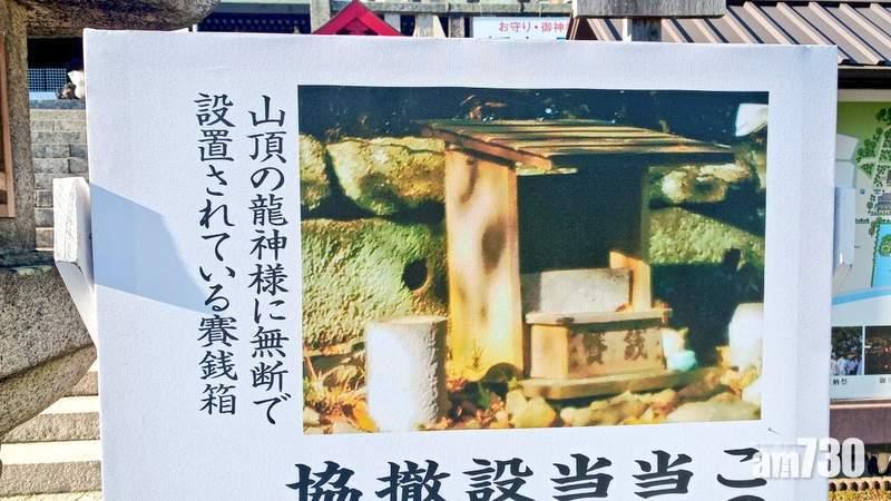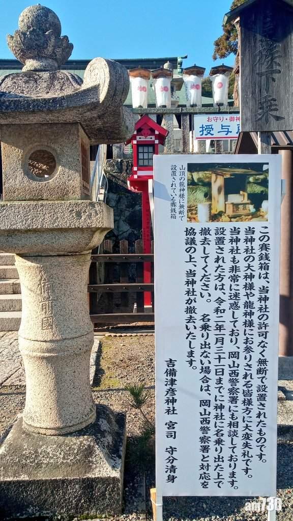 吉備津彥神社最近張貼告示,指照片中的一個錢箱,是「未經本神社許可設置。對來到本神社參拜大神以及龍神的各位感到非常抱歉。本神社也非常困擾,已經通報岡山西警察署。設置此錢箱的人,請在令和2年1月31日前向本神社出面自首並撤除。沒人出面的話,在與岡山西警察署的協議對策下,由本神社撤除。」