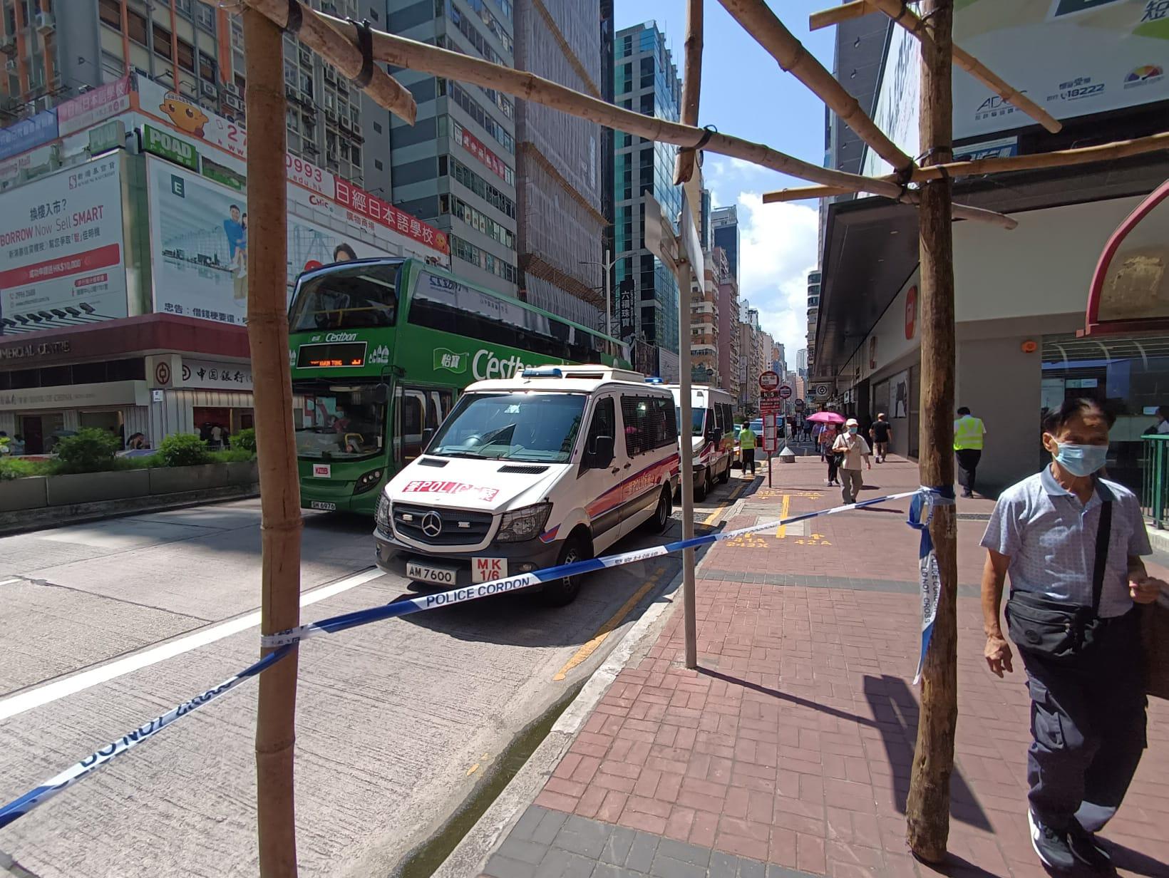 旺角新興大廈今日(8日)有石屎從高處墮下,鑿穿巴士車頂幸無人受傷,大廈裝修工程負責人事後被捕。新興大廈目前正進行外牆維修工程,外圍有一個用綠色尼龍網包圍的竹棚架,亦有建築工人在意外後發現尼龍網高層位置破了一個洞。