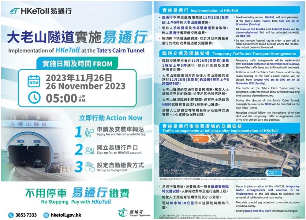 運輸署今(15日)宣布,大老山隧道將於11月26日(周日)上午5時起實施「易通行」,屆時所有人手收費亭及快易通車道將會取消,駕駛者可直接駛過收費廣場,透過「易通行」繳交隧道費,毋須停車或排隊付款。