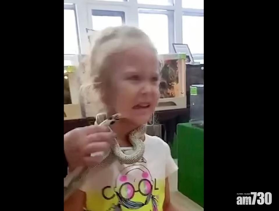 女童讓蛇纏頸拍照,顯得有些惶恐不安。(互聯網)