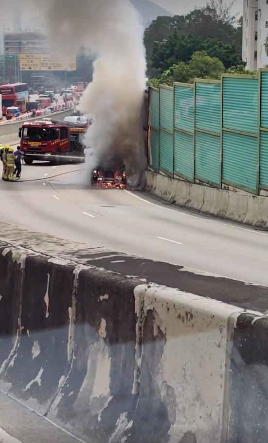 龍翔道四驅車突起火自焚傳出爆炸聲,司機急跳車逃生。(fb「屯門公路塞車關注組」影片截圖)
