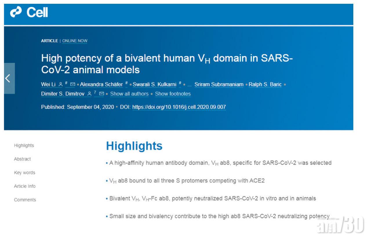 全球傾力研發新冠肺炎疫苗之際,有科學家則正尋求「解藥」。美國匹茲堡大學科學家近日發表研究報告,指已成功從新冠肺炎抗體中,分離出僅得抗體本身十分一大小的生物分子,可針對性及完全地摧毀新冠病毒SARS-CoV-2,目前正以此研究名為「Ab8」的新冠肺炎藥物,或令此病變得有藥可治,而服後無副作用之餘,兼可防疫。