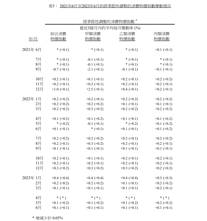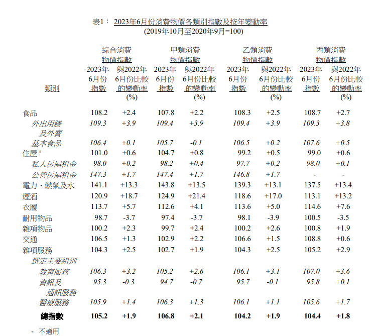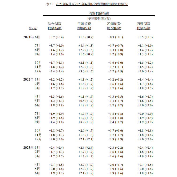 而以2023年上半年合計,綜合消費物價指數較一年前同期上升2%;按季計算,指數同樣較一年前同期上升2%;截至2023年六月止的12個月,綜合消費物價指數較一年前同期平均上升2.1%。