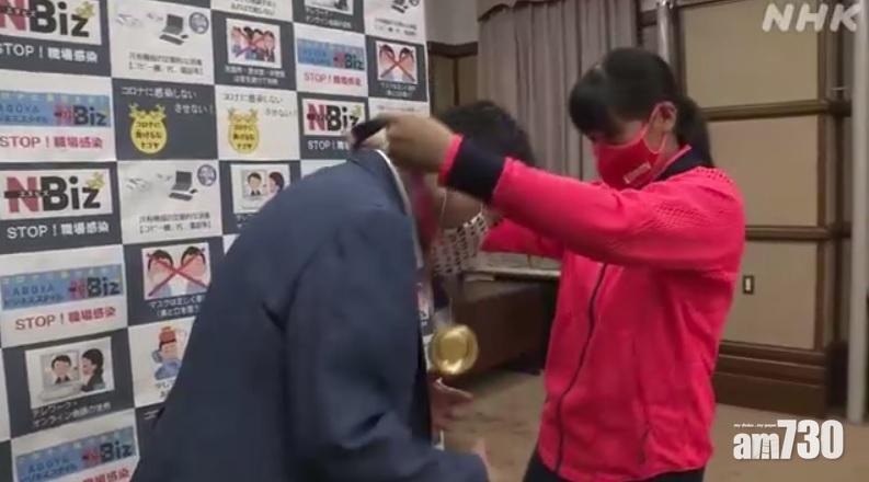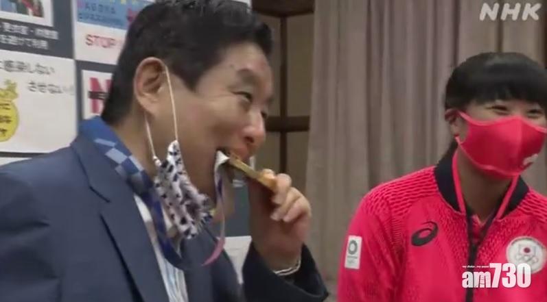 日媒報道,名古屋市出身的後藤希友前往市政府,向市長河村隆之報告奪得奧運金牌。後藤將金牌掛在河村頸上,說了一句「蠻重的」後,突然拉下口罩大口咬金牌。戴著口罩的後藤看到自己的金牌被河村大口咬下時,先是有點吃驚,隨即露出笑意。