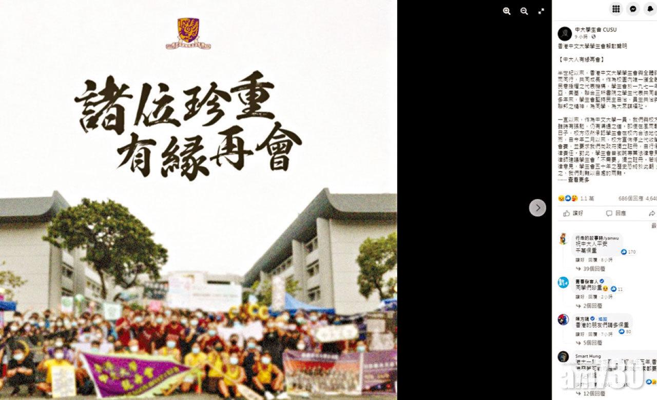 有51屆歷史的中大學生會宣布解散,中大學生會在社交平台發聲明指,校方要求學生會向政府獨立註冊,自行承擔法律責任,學生會諮詢法律意見後,為同學的最大利益著想,有此決定。中大校方對學生會的決定感到遺憾,指學生事務處將處理學生會過往負責的服務,以減少影響。