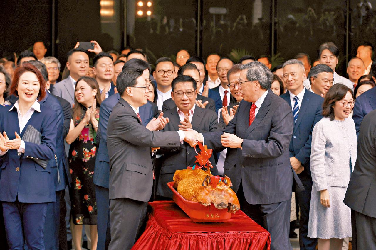 李家超(左)和梁君彥(右)與一眾官員、議員出席竣工儀式。