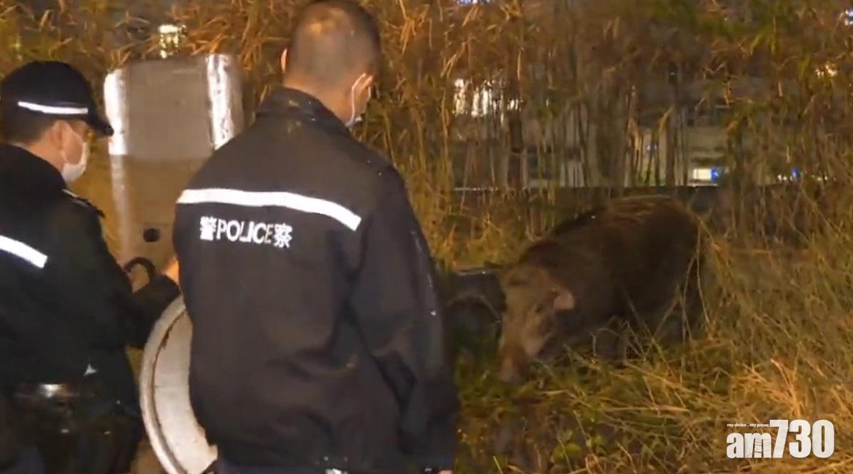 自漁護署公布「殺豬令」後,野豬在市區出沒受到關注。鰂魚涌昨晚有2隻野豬出沒,擾攘近9小時,被漁護署人員早上捉走。