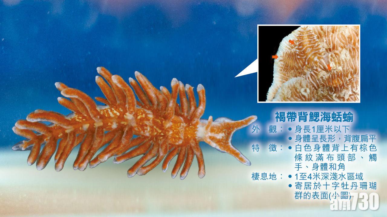至於新發現的兩種「海蛞蝓」同以珊瑚為食糧,屬於「背鰓海蛞蝓屬」,此前全世界只有9個物種。其中「食角孔珊瑚背鰓海蛞蝓」在橋咀洲和赤洲發現,寄生在「角孔珊瑚」,並以其組織為食物,故以此名命;牠身長達3厘米,與同屬的其他物種不同,背上長有多對棕色手指狀、末端白色的「角突」,以及背部有一個隆起的白色圓形小駝峰,小駝峰與牠寄生珊瑚的咀相似,角突可偽裝成珊瑚的觸手,如魚類等捕食者更難發現。另一款新的「褐帶背鰓海蛞蝓」,身長1厘米以下,以「十字牡丹珊瑚」為食物,白色身體帶有棕色條紋,並滿布頭部、觸手和角突,通常生長於淺水區。