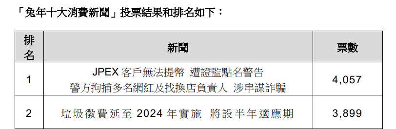 消委會周二(6日)公布兔年十大消費新聞,其中由「JPEX案」登首位,「垃圾徵費」及「日出康城單位鑿穿主力牆」分別奪得第二及第三位,康城事件亦同時獲選為「最離譜」新聞;至於多項與疫後復甦相關的新聞亦進佔入選十大之列。