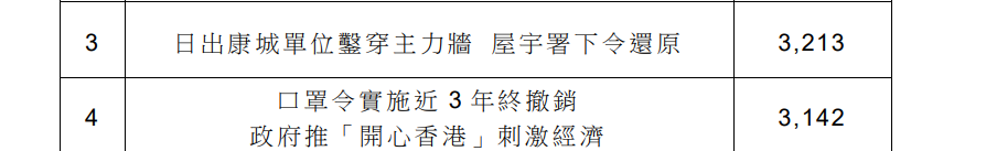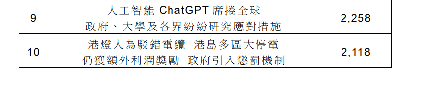此外,「日本排放核廢水 港禁10都縣水產進口 本港市民再『盲搶鹽』囤貨」獲3,054票成第5位;「港燈人為駁錯電纜 港島多區大停電 仍獲額外利潤獎勵 政府引入懲罰機制」獲2,118票入選十大。