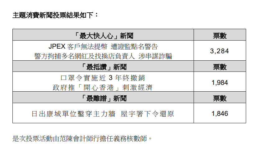 當中去年轟動一時的「JPEX案」,多位知名人士相繼被捕,加上案件所涉及的總金額高達十多億元,「JPEX 客戶無法提幣遭證監點名警告 警方拘捕多名網紅及找 換店負責人涉串謀詐騙」最終以4,057票登上榜首,同時以壓倒性的3,284票,被推選為「最大快人心」消費新聞,得票率佔總投票人數 71%,反映消費者關注虛擬交易平台的安全及可靠性,亦期望監管機構對可疑平台採取行動。
