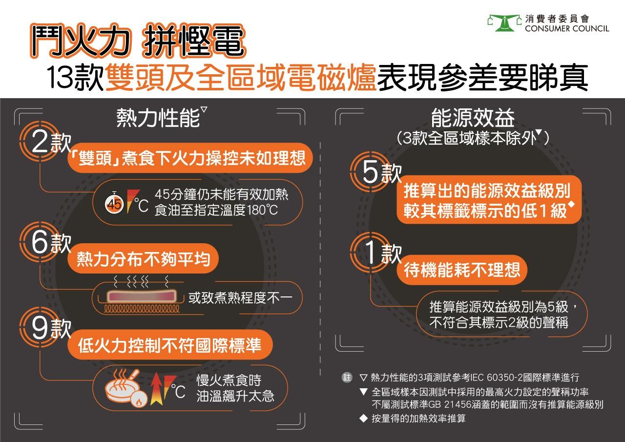 消費者委員會測試市面上13款雙頭及全區域電磁爐,發現有2款樣本在兩個爐頭同時使用時,爐頭之間的火力操控未如理想,花45分鐘仍未能將食油加熱至指定溫度。有6款樣本的熱力分布不夠平均。近 七成樣本亦不符合國際標準IEC 60350-2對低火力控制的要求,「慢火」煮食表現遜色。能源效益方面,有5款樣本根據測試結果推算所得的能源效益級別,較其標籤低一級,另有1款量得的待機能耗不理想導致其推算出的能源效益級別為最低的5級,不符合其標示的2級,測試結果已轉交機電工程署跟進。