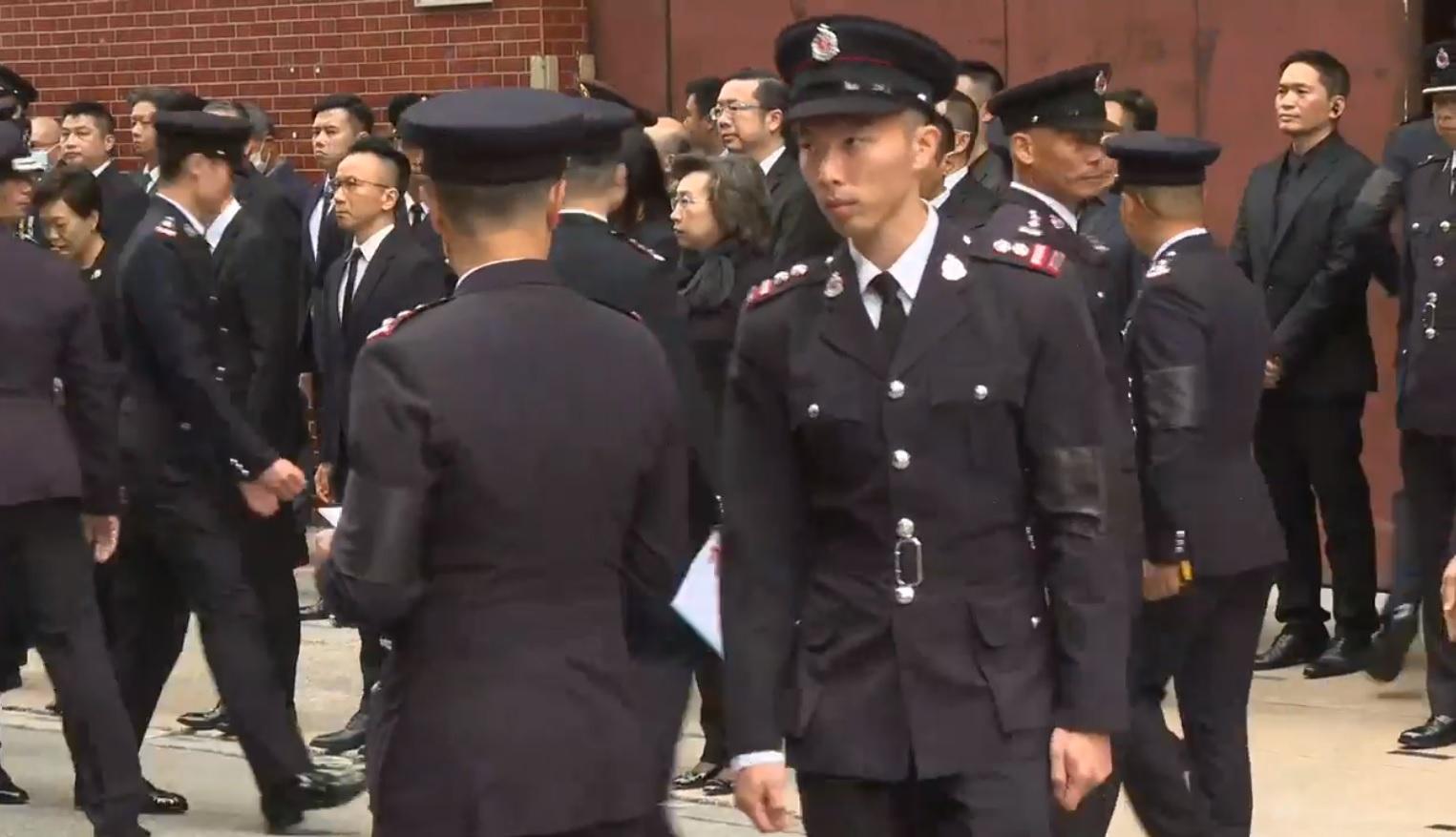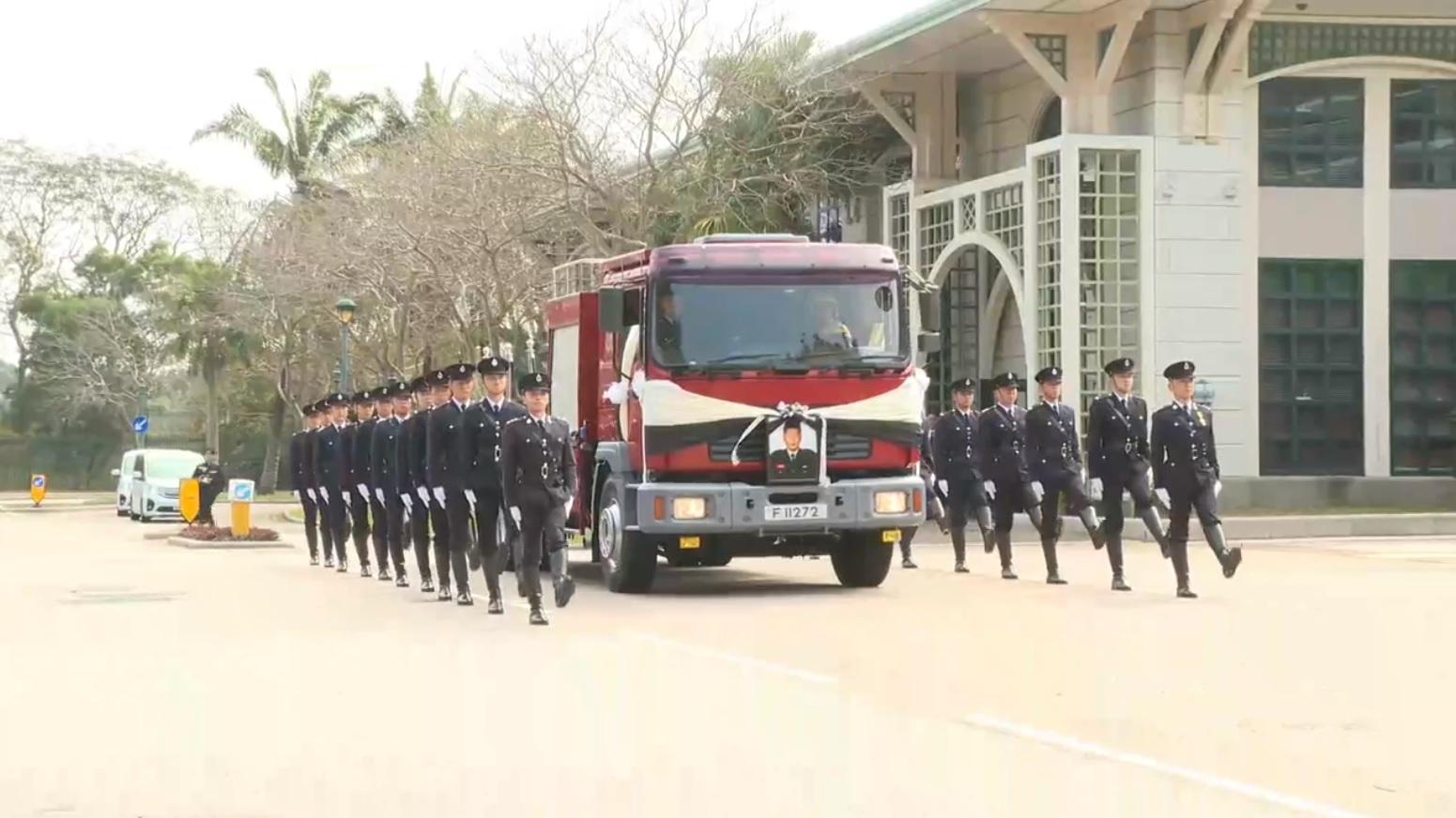 今日早上9時許,一眾消防處人員身穿整齊制服,並於左手臂上繫上黑布,於紅磡世界殯儀館靈堂前聚集,隨後列隊進入靈堂致意。