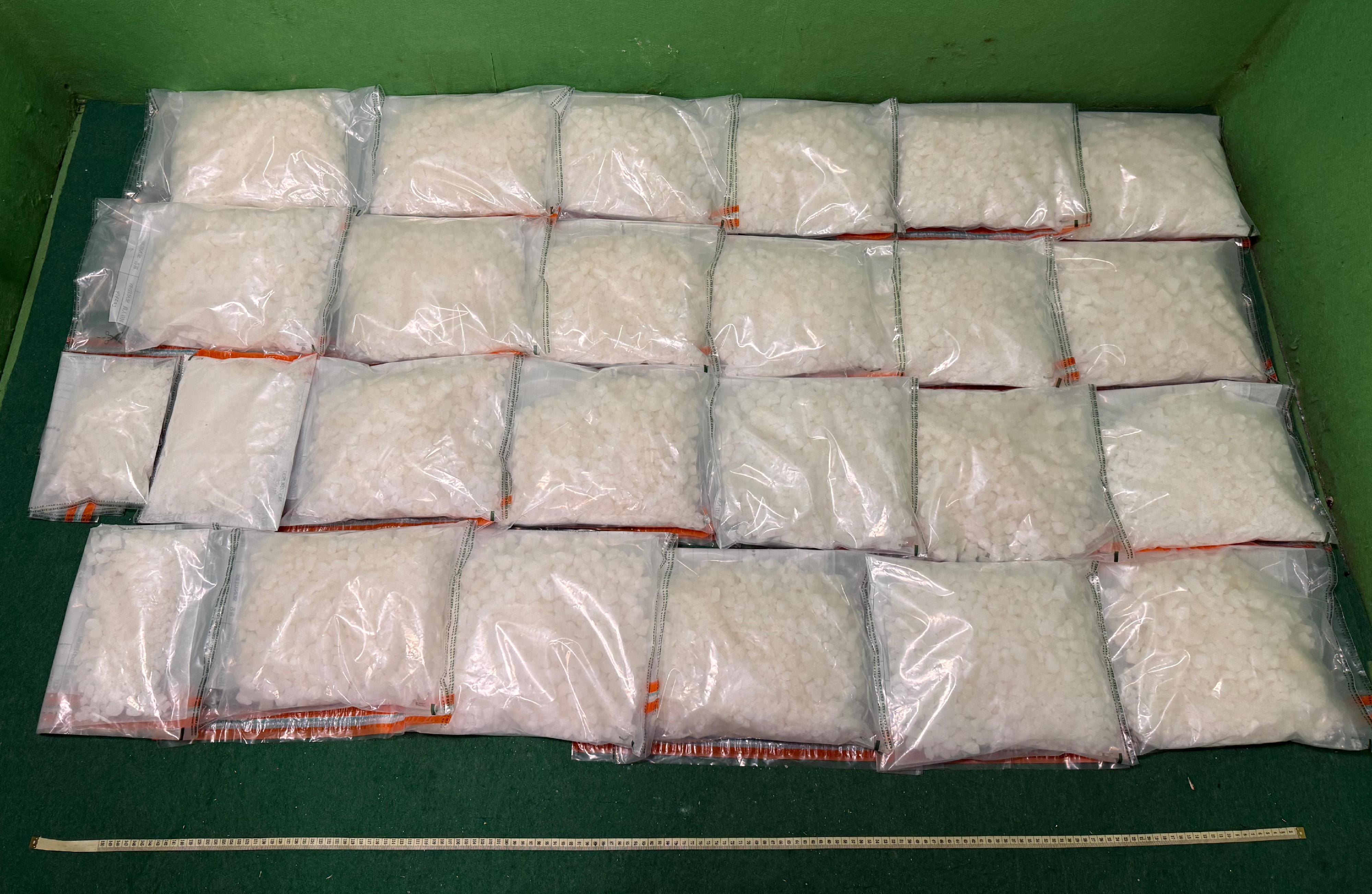 香港海關在香港國際機場偵破一宗行李藏毒的販毒案件,檢獲約四十七公斤懷疑氯胺酮,估計市值約二千一百萬元。圖示檢獲的懷疑氯胺酮。(海關圖片)