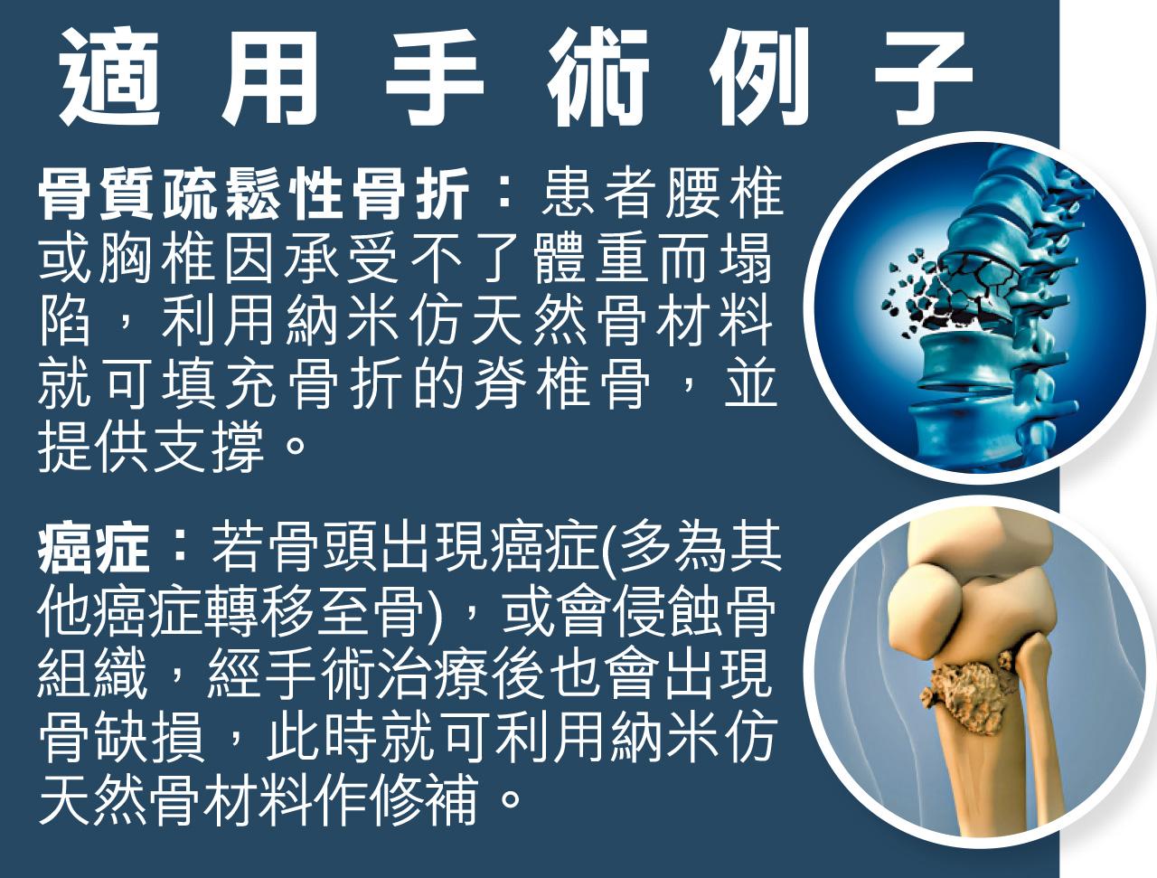 傳統上治療骨缺損,要用到「骨水泥」幫助骨骼穩定,然後利用自體骨、異體骨或人工骨作修補,惟各種材料都有其限制。港大醫學院最近研發出「納米仿天然骨材料(CIOHM)」,則兼具如真實骨頭的韌性,不易折斷及避免傷及附近骨組織,更能夠加速患處癒合。