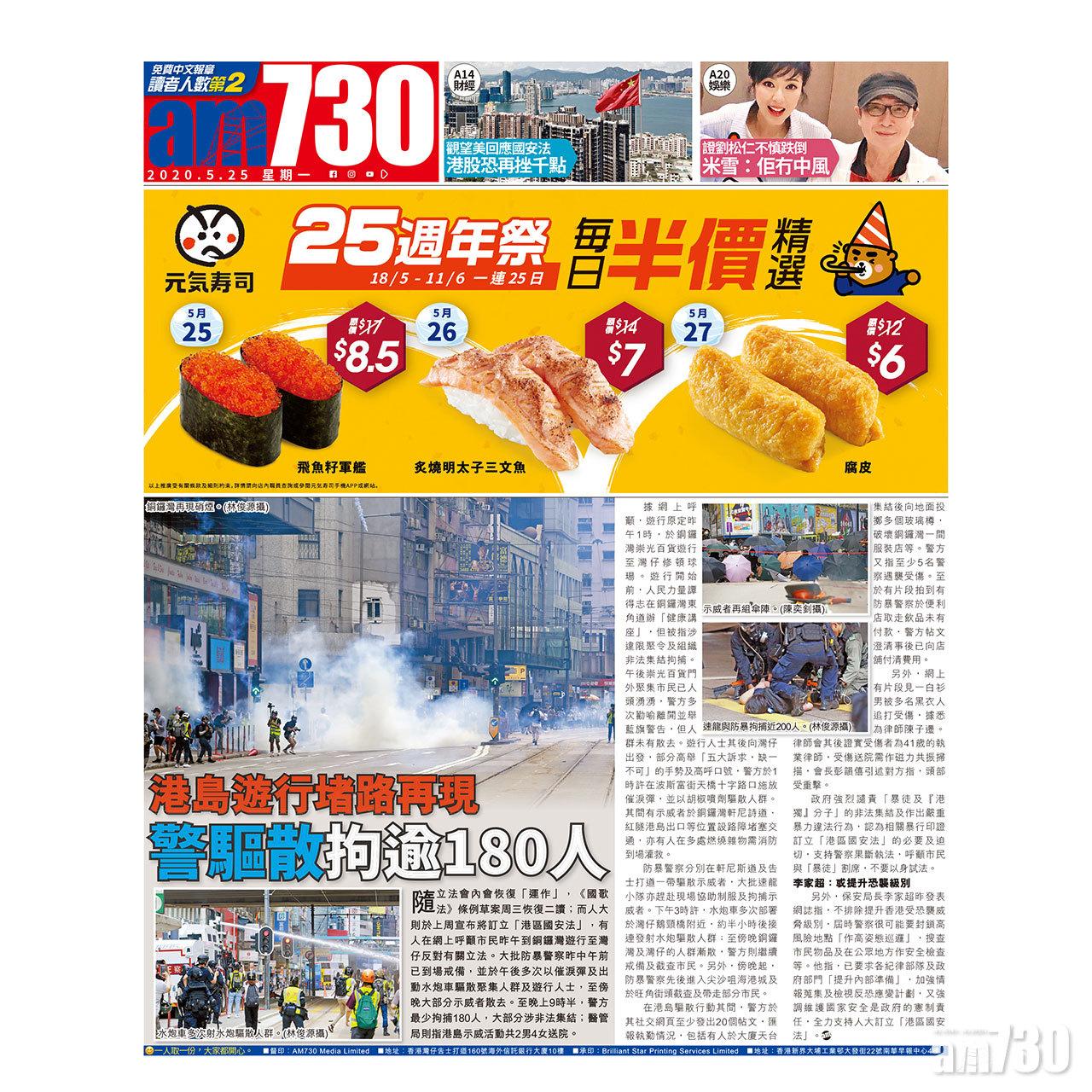 隨立法會內會恢復「運作」,《國歌法》條例草案周三恢復二讀;而人大則於上周宣布將訂立「港區國安法」,有人在網上呼籲市民昨午到銅鑼灣遊行至灣仔反對有關立法。大批防暴警察昨中午前已到場戒備,並於午後多次以催淚彈及出動水炮車驅散聚集人群及遊行人士,至傍晚大部分示威者散去。至晚上9時半,警方最少拘捕180人,大部分涉非法集結;醫管局則指港島示威活動共2男4女送院。