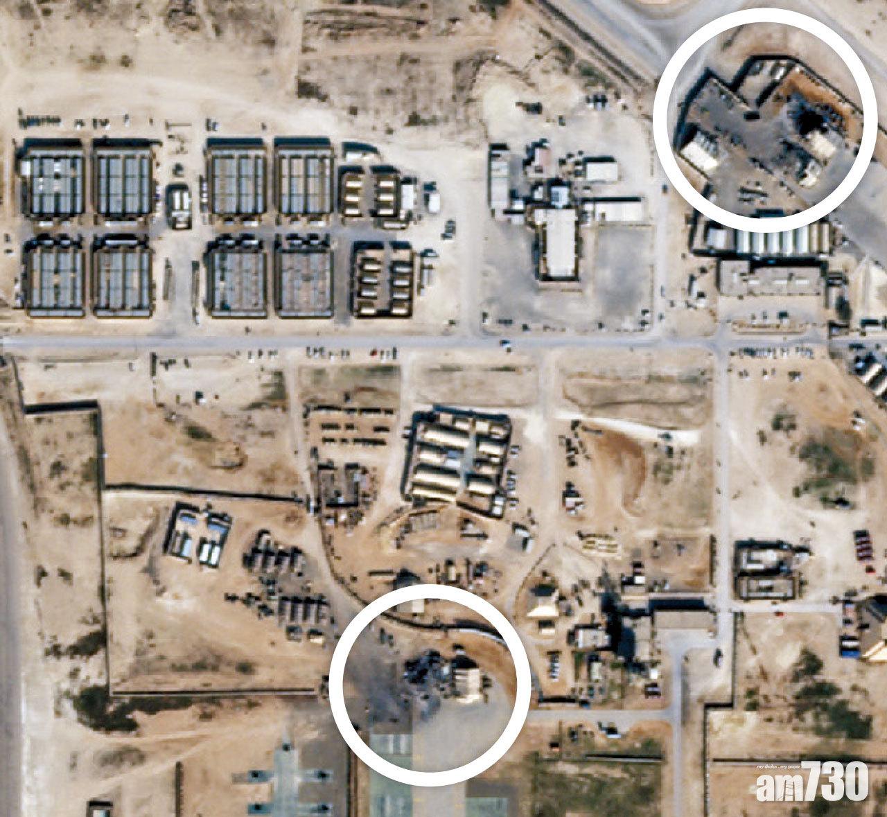 衛星圖顯示美軍基地部分中彈位置(白圈)。(美聯社)