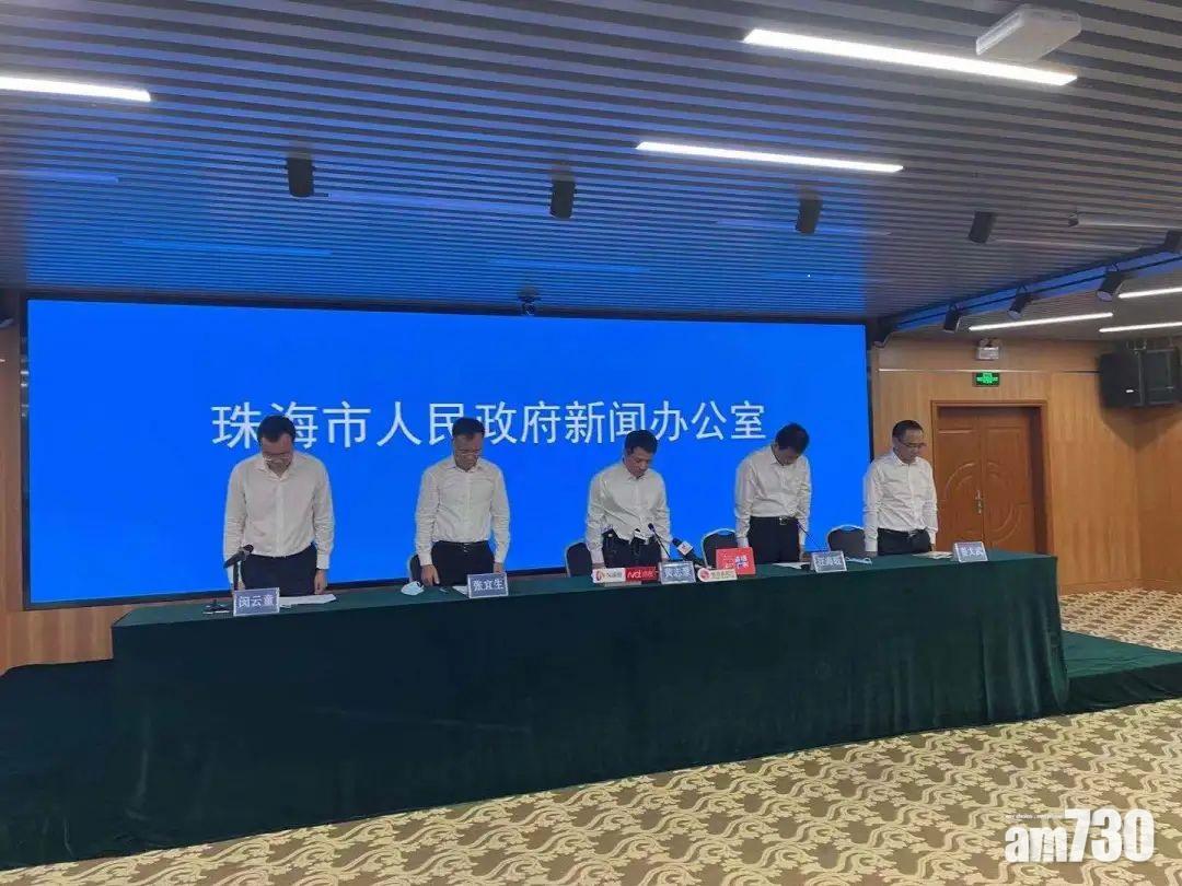 珠海市長黃志豪(中)與其他政府官員,今早在事故發布會上為遇難者默哀。(互聯網)