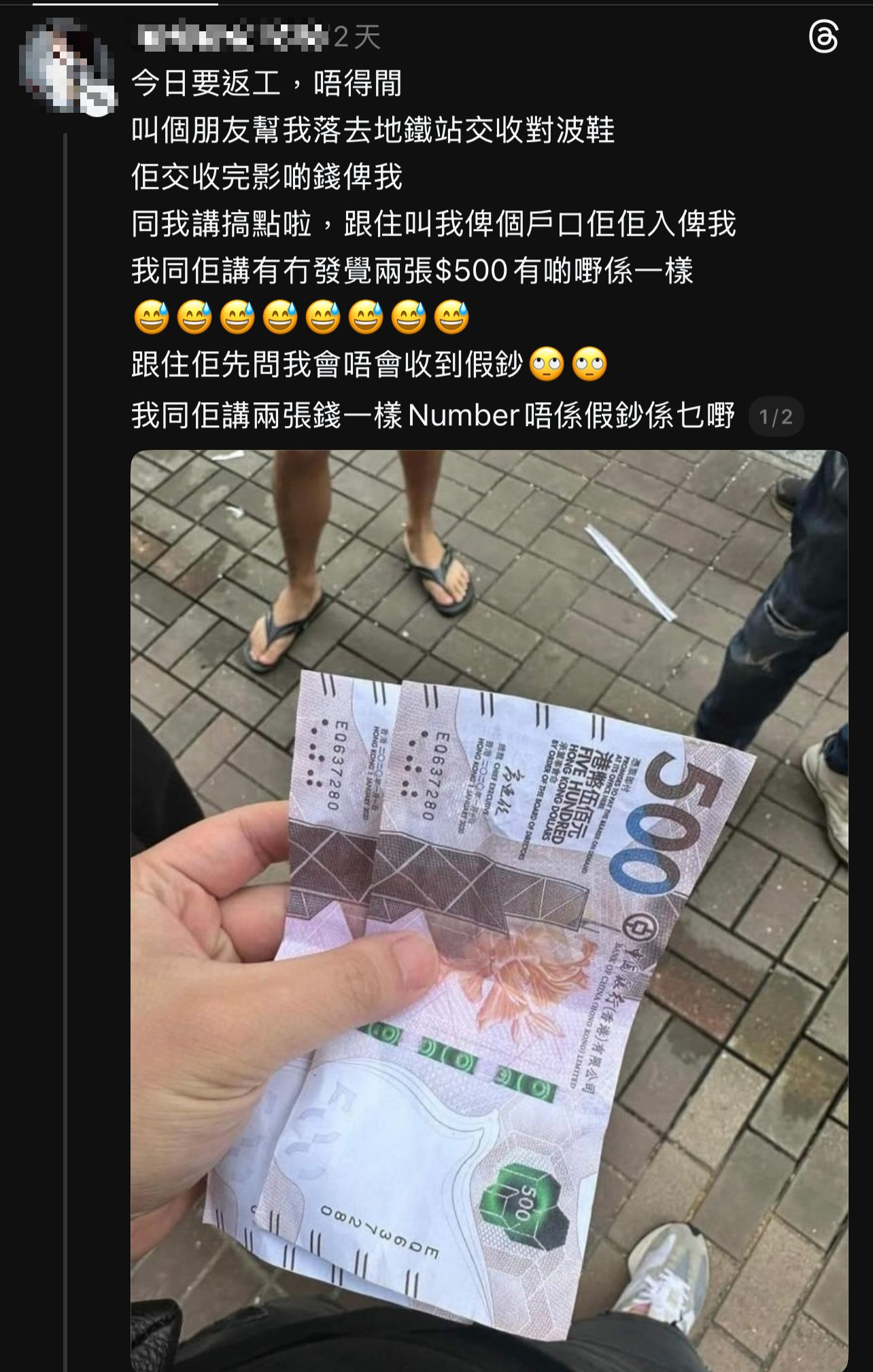男子在社交平台Threads發文訴說經歷,指當日叫朋友幫忙到港鐵站交收波鞋。當男子看到朋友傳送給他的紙幣相片,發現兩張500元紙幣的編號是一樣。