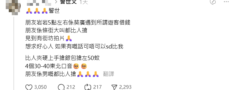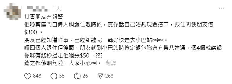 女網民發文指昨日下午約5時在葵芳廣場門口遇到4名大約30至40歲、有東北口音的內地人,指不夠現金乘車,向事主的朋友借300元。朋友與4名內地人糾纏一番後,很快轉往附近的小巴站。怎料4人一直尾隨,朋友快到小巴站時取出銀包想拿八達通乘車,內地人則指看到他有錢,很快地取走銀包內的50元。
