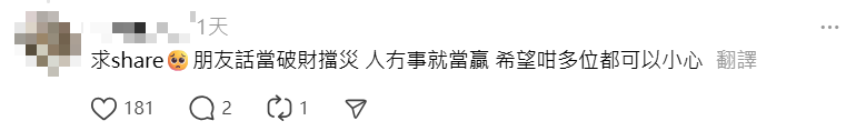 事主的朋友指當破財擋災,「人冇事就當贏」,希望今次發文提醒大家小心。警方回覆傳媒查詢時則表示,當日未有接獲相關報案。