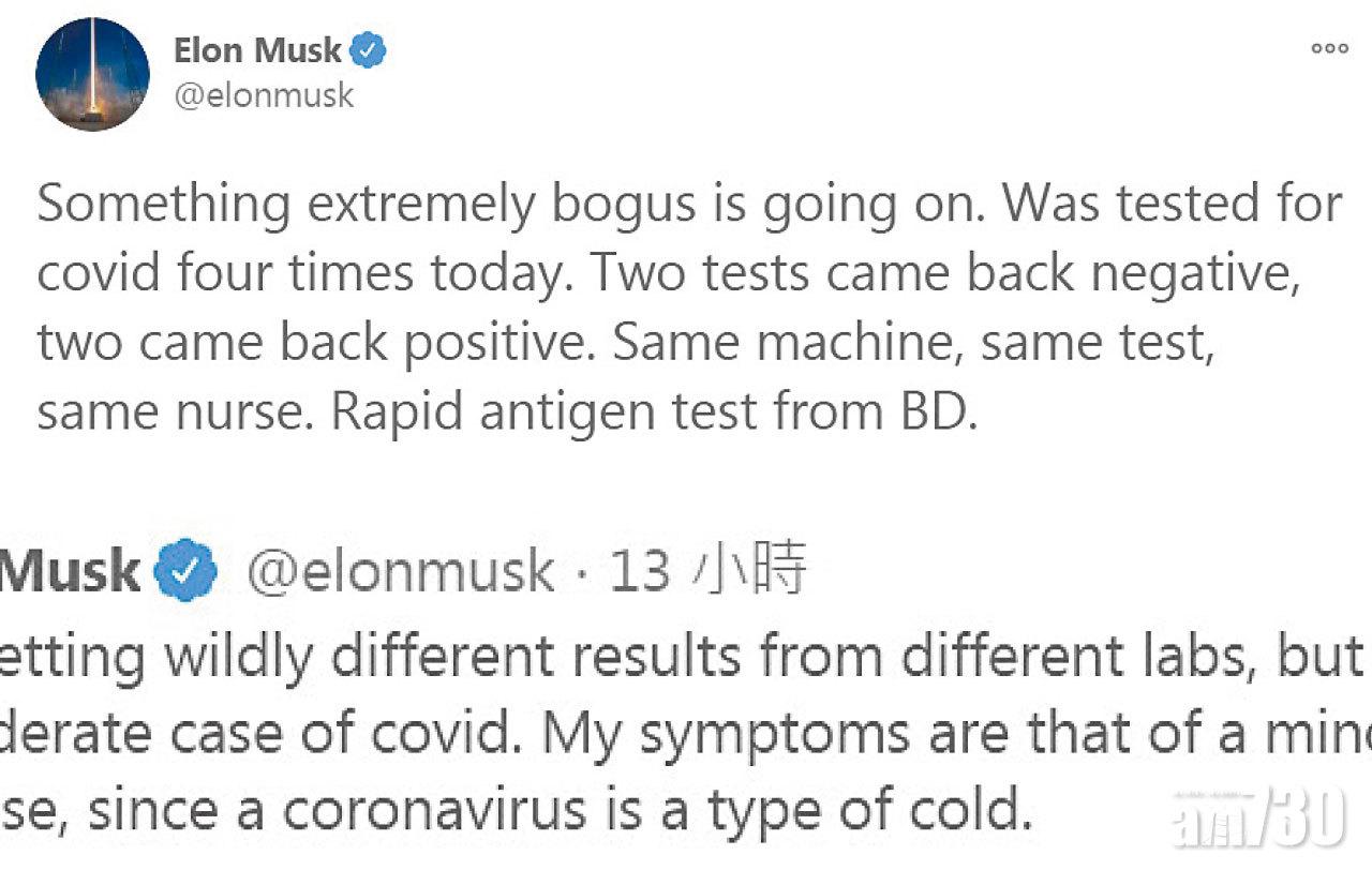 馬斯克上周五發文稱,當日接受4次快速抗原測試,同一部機器、同一名護士做同一種檢測,卻出現兩次陽性、兩次陰性結果,形容「有些極假的事情正在發生」。他昨再發文稱,「不同實驗室做的檢測,結果大不同,但我很可能感染中度新冠肺炎。我的症狀像輕度感冒,這並不意外,因為冠狀病毒疾病本來就是感冒的一種」,但沒說明是否接受準確度比快速測試高的PCR檢測。