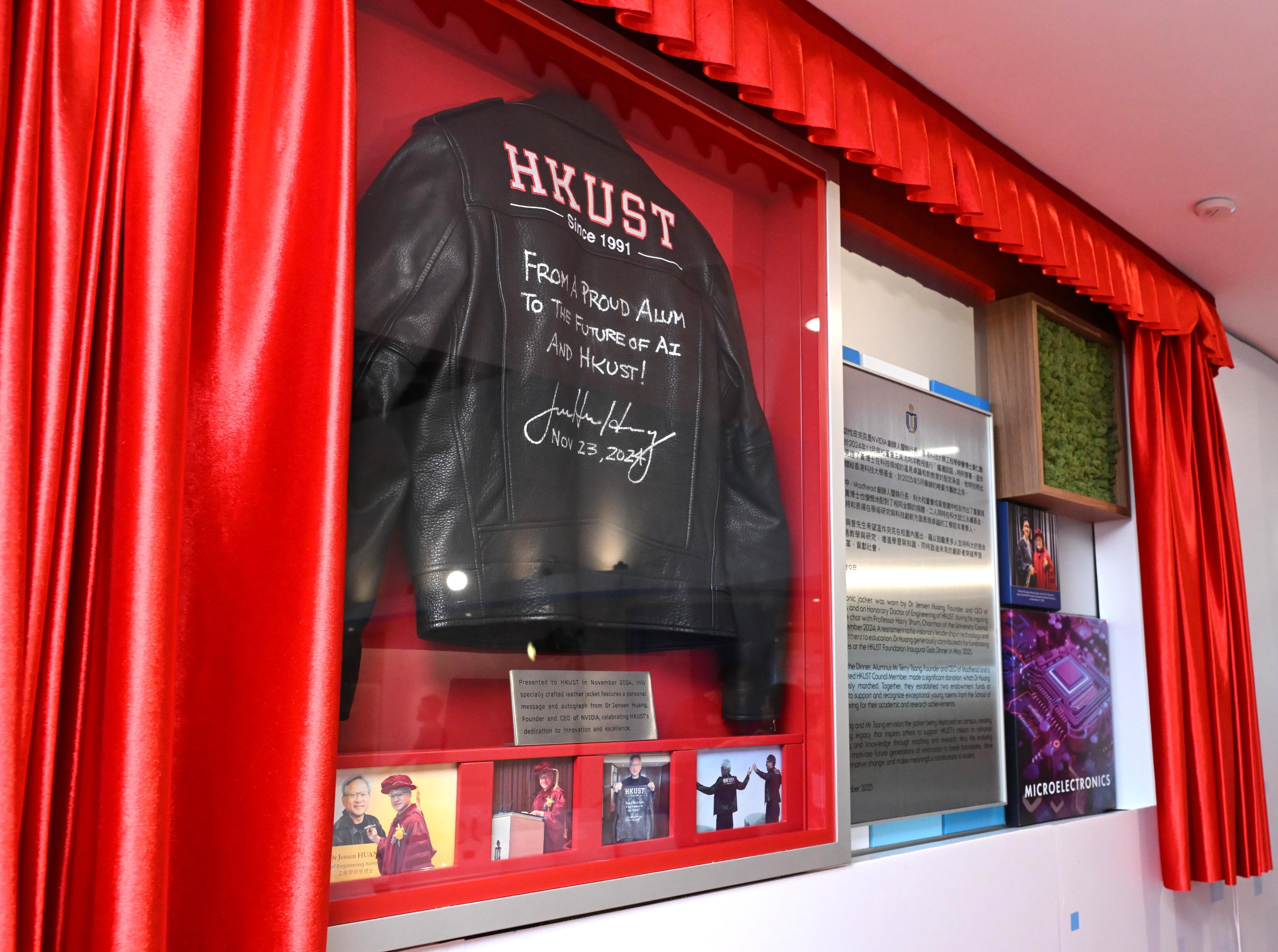 香港科技大學今日展出由其傑出校友、NVIDIA行政總裁黃仁勳饋贈的簽名皮衣。科大宣布正式成立「科大頂尖工程學者獎」,獎學金得到黃仁勳及科大校董會成員曾建中的捐款而設立。