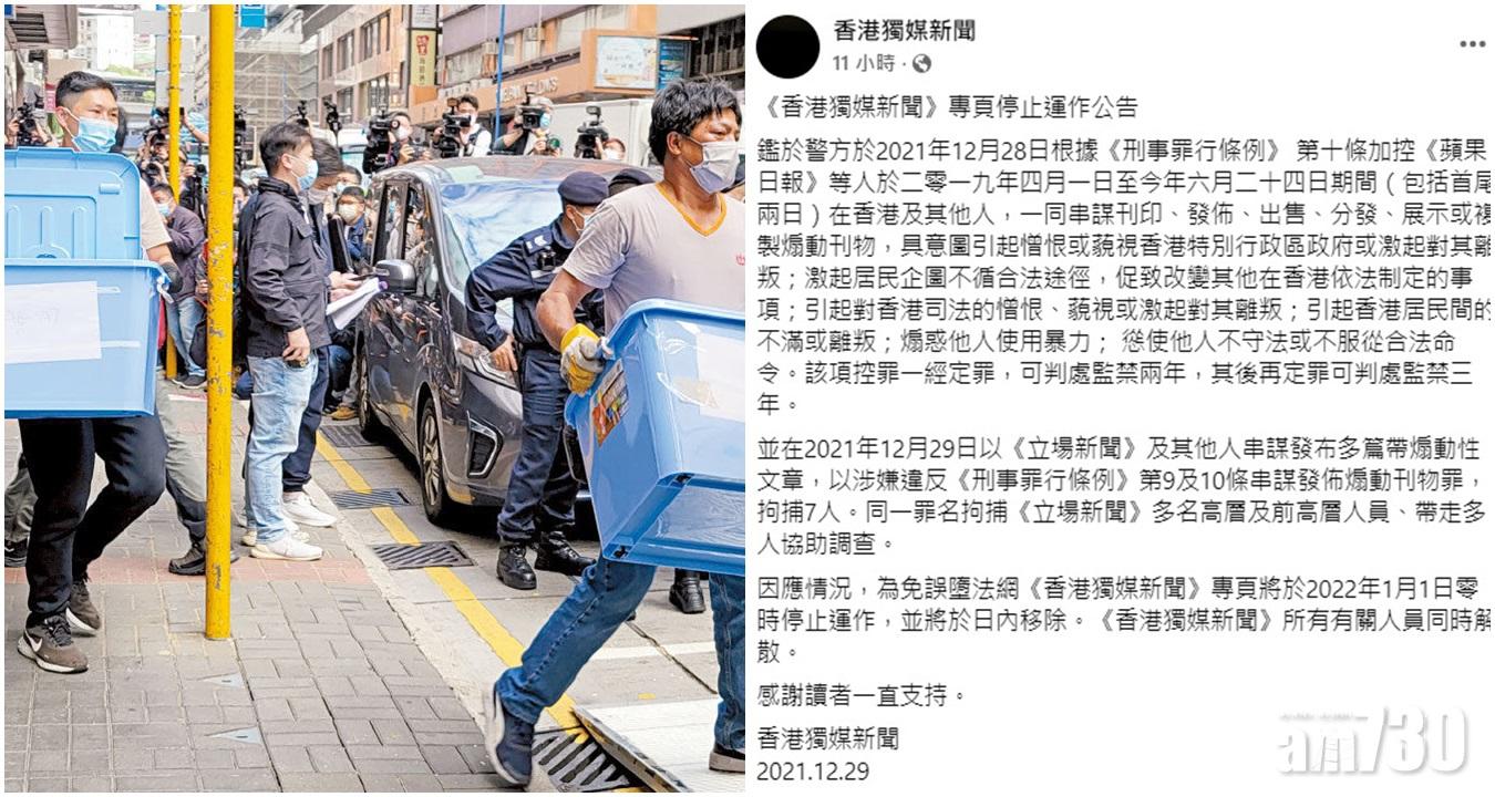 警方先後以「串謀發布煽動性刊物」罪名,加控《蘋果日報》前高層,以及拘捕網媒《立場新聞》高層及前高層。本港另一網媒《香港獨媒新聞》在社交網站fb宣布,因應上述情況,為免誤墮法網,將於2022年1月1日零時停止運作專頁,並將於日內移除。《香港獨媒新聞》所有有關人員同時解散。
