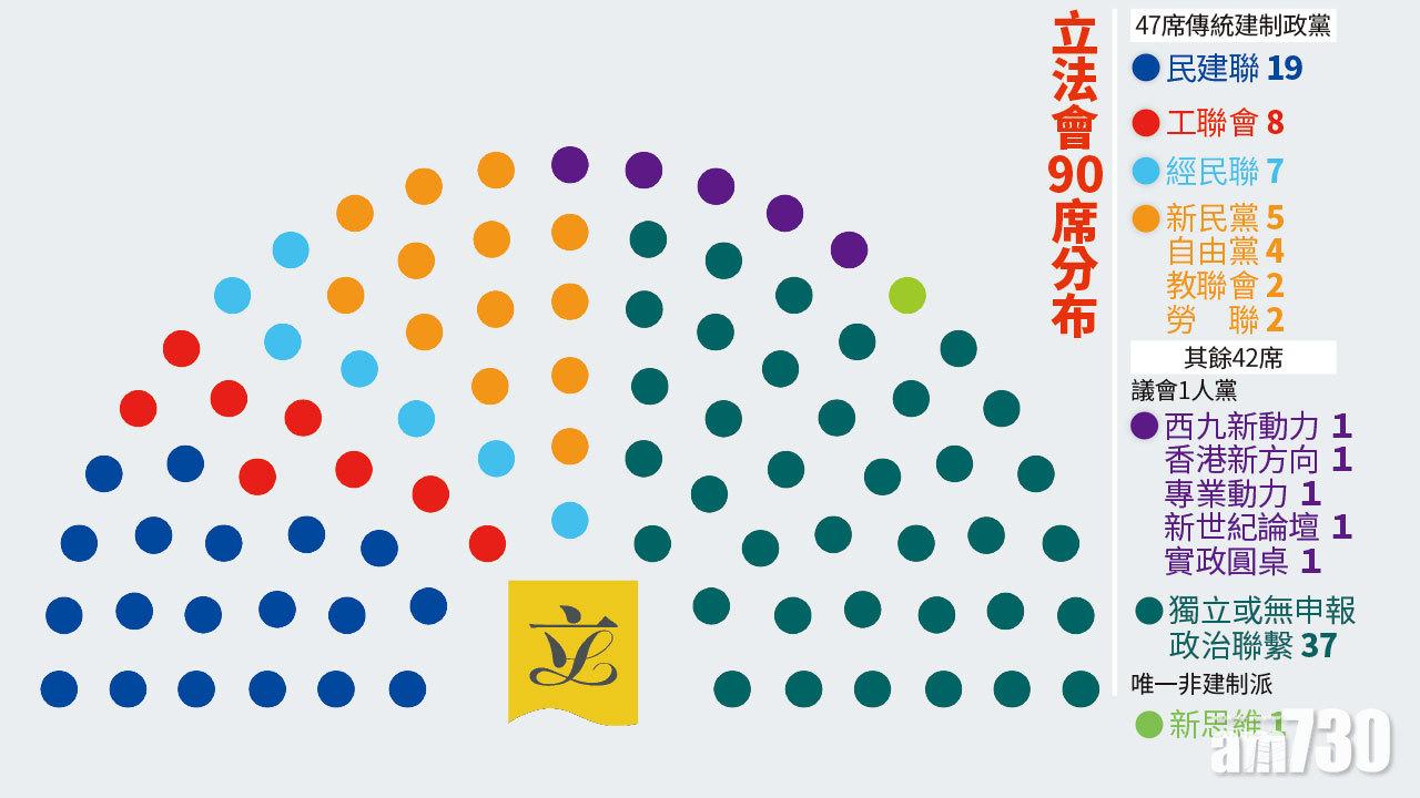 新一屆立法會90個議席中,民建聯佔19席,比上屆多6席,繼續是議會中第一大黨;該黨在10個地方選區各佔1席,當中周浩鼎及李慧琼更分別以93,195及95,976票,成為今屆票王、票后。民建聯主席李慧琼指,未來會加強與不同黨派合作,又不猜測投票率低的原因。工聯會取得8個議席,比上屆增5席,成為第二大政團;經民聯有7席,是今次唯一少了議席的傳統建制政黨。新民黨有5席,增加3席,主席葉劉淑儀對結果非常滿意,形容是符合預期兼「大勝」。自由黨則維持4席。教聯、勞聯、實政圓桌等各佔1至2席,其餘三十多個議席的當選者,參選時報稱無政治聯繫。
