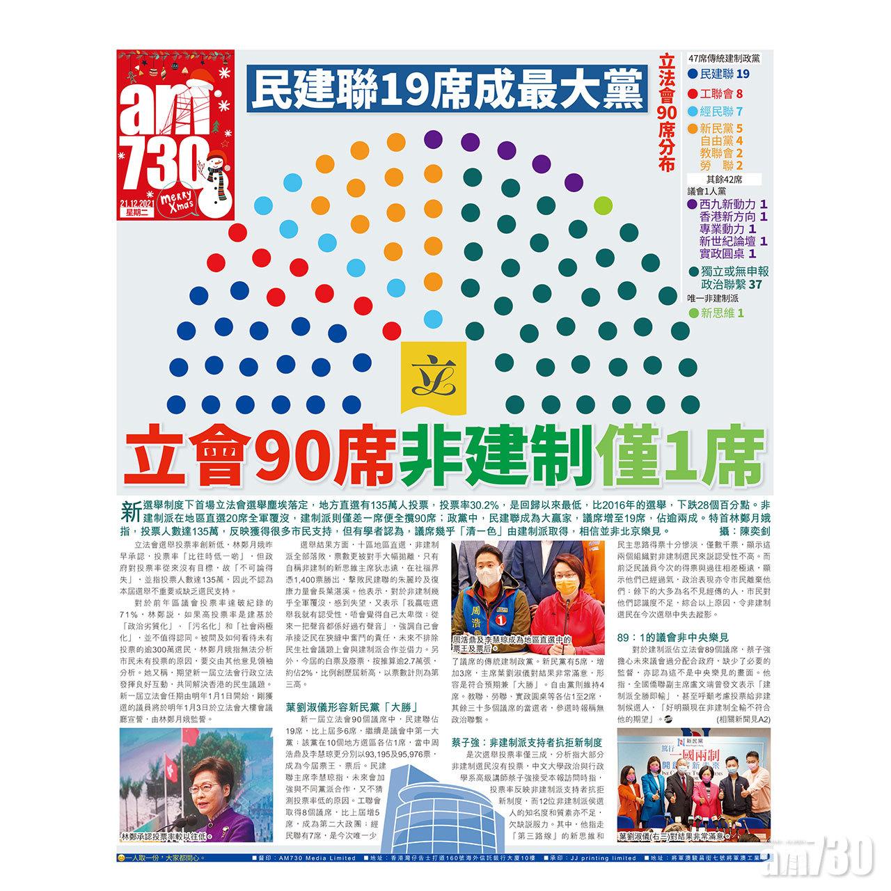 新選舉制度下首場立法會選舉塵埃落定,地方直選有135萬人投票,投票率30.2%,是回歸以來最低,比2016年的選舉,下跌28個百分點。非建制派在地區直選20席全軍覆沒,建制派則僅差一席便全攬90席;政黨中,民建聯成為大贏家,議席增至19席,佔逾兩成。特首林鄭月娥指,投票人數達135萬,反映獲得很多市民支持,但有學者認為,議席幾乎「清一色」由建制派取得,相信並非北京樂見。攝:陳奕釗