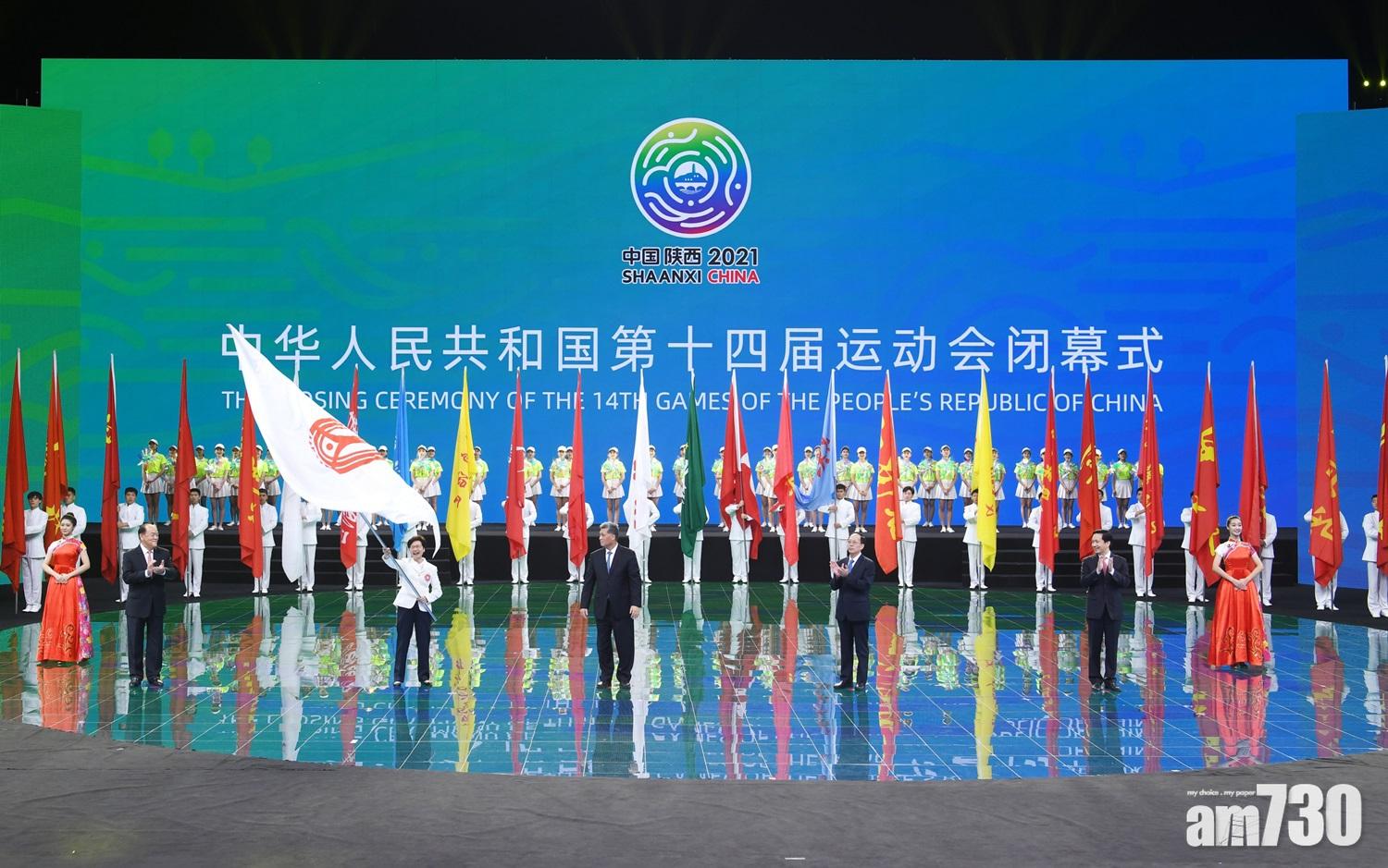 第14屆全運會昨閉幕,閉幕禮昨晚8時在西安奧體中心體育館舉行,廣東省省長馬興瑞,聯同特首林鄭月娥、澳門特首賀一誠,先後從主委會陝西省省長趙一德及國家體育局長苟仲文接過會旗,完成會旗交接儀式,象徵粵港澳3地正式承接下屆、2025年全運會。本港將主辦其中部分項目。