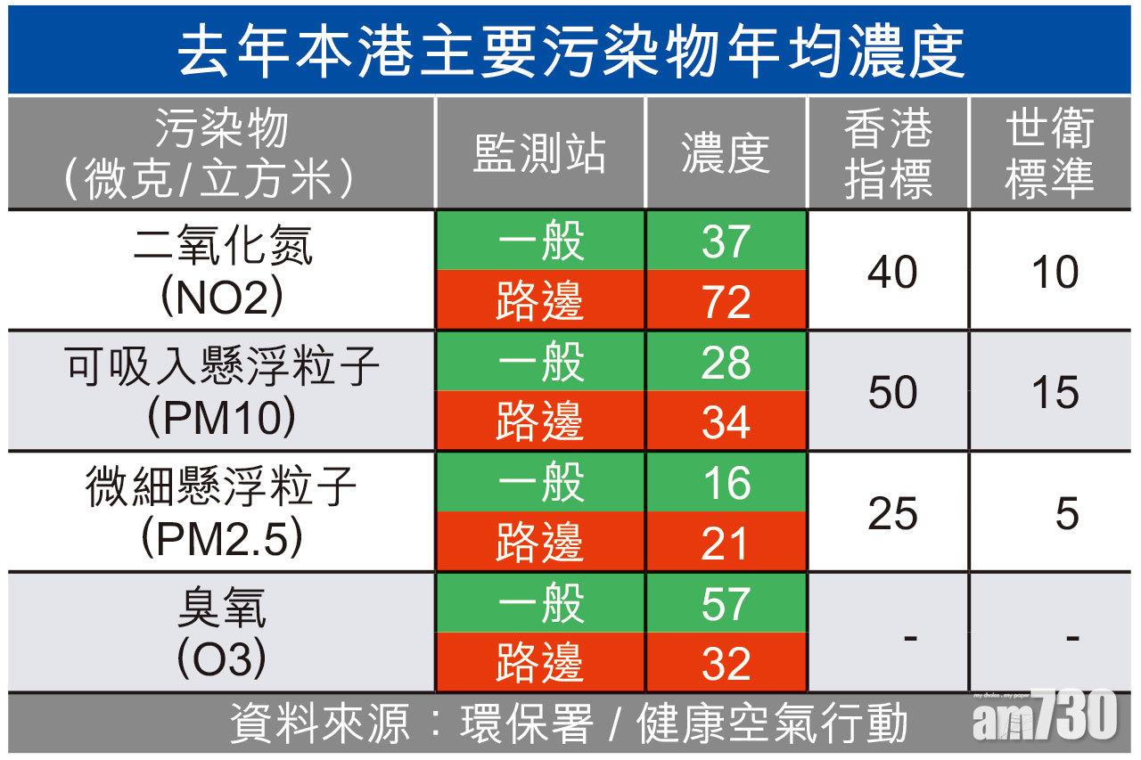 「健康空氣行動」分析去年環保署空氣質素監測站數據,主要來自車輛排放的二氧化氮(NO2)於過去十年呈下降趨勢後,去年重新回升。其中去年路邊NO2年均濃度為72微克/立方米,較本月起生效的香港空氣質素指標的40微克/立方米高,更比世衛標準高出六6倍。路邊微細懸浮粒子(PM2.5)年均濃度則為21微克/立方米,雖符合本港標準,但較世衛標準高3倍。