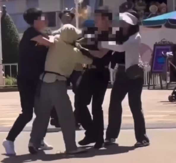 4人纏鬥期間,有迪士尼男工作人員見狀即分開雙方,但不過2名男子未有停手,續揮拳激戰,令站在中間的工作人員亦不幸遭殃,及後終成功分開雙方,又進行在場勸導。
