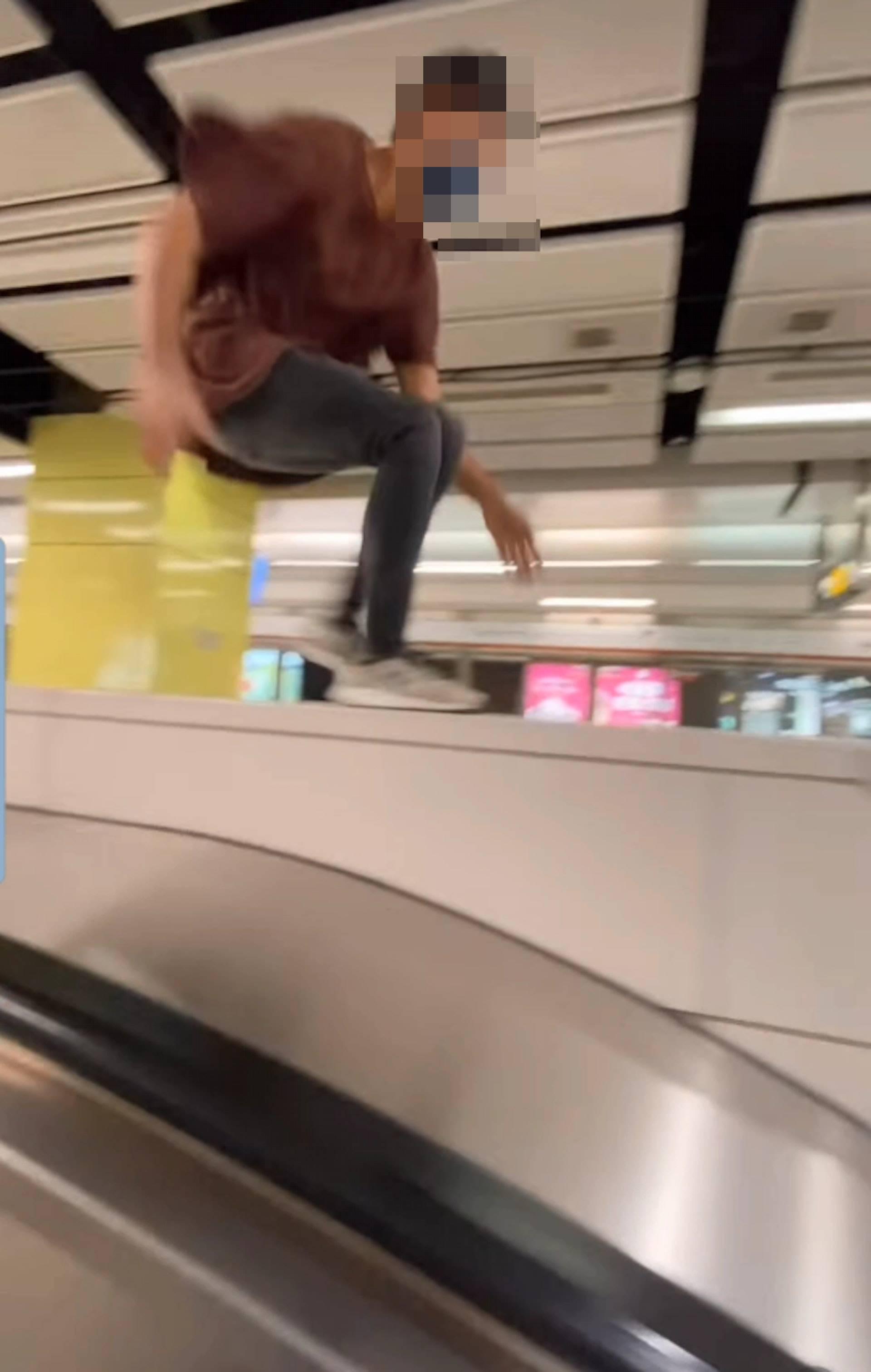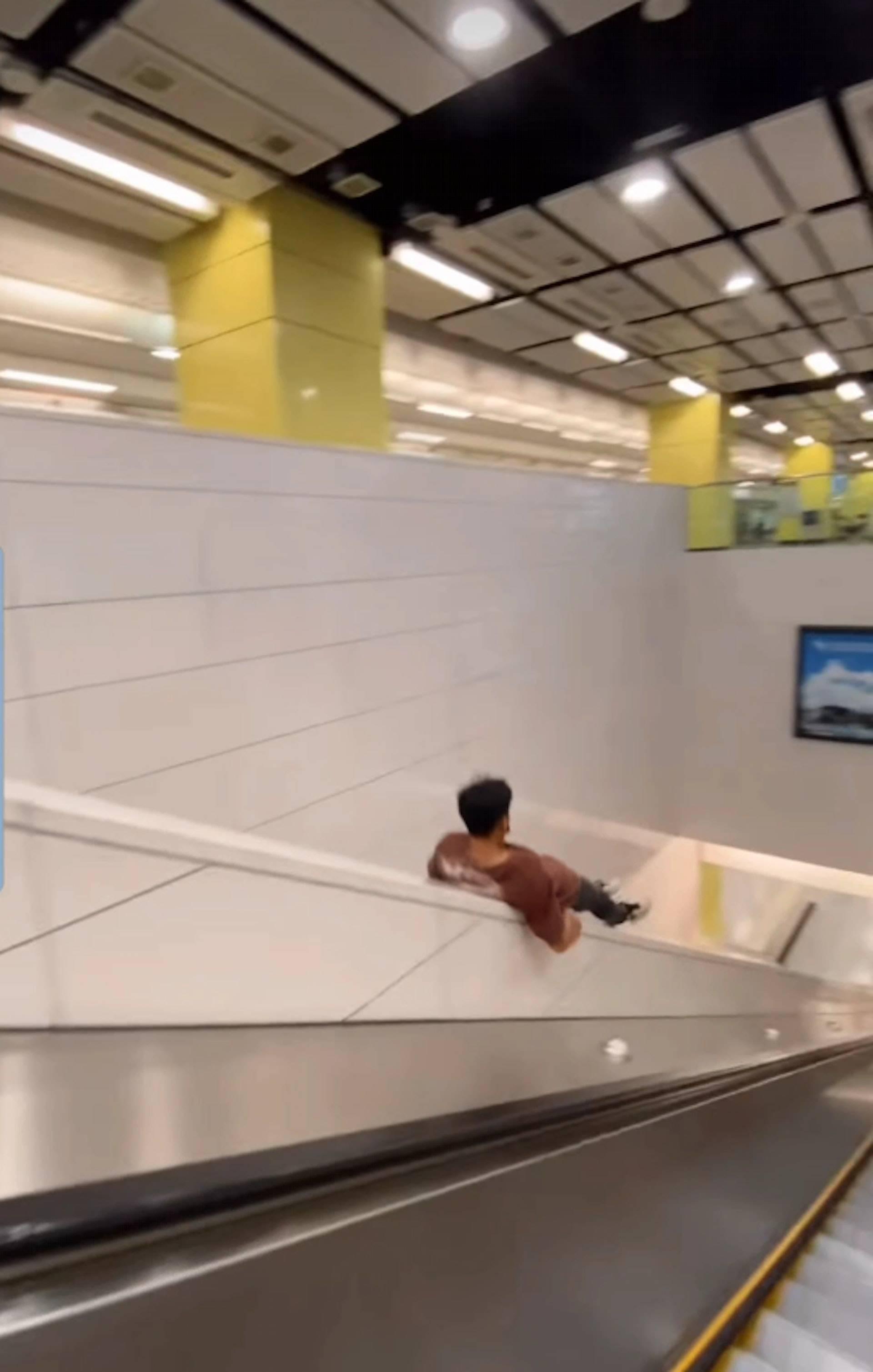 其中一條片段,只見該男子從約2、3層樓,高約10米的扶手梯頂瀡到地面。另一條片段則見,該男子先助跑,然後跳上扶手電梯旁的斜台,然後如瀡滑梯般瀡落地面,到梯台盡頭後跳落地離開,助跑連離開全長不過10秒。,旁邊的途人並無太大反應,近日獲多名網民轉載。
