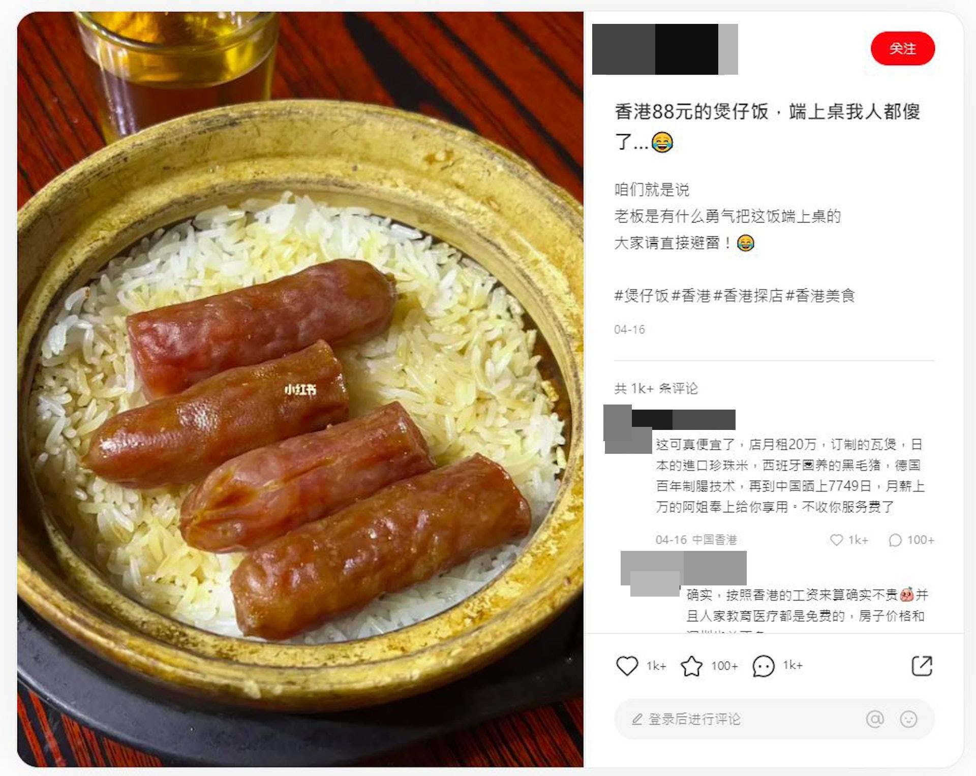 內地男幫襯88蚊港式煲仔飯直稱中伏。(小紅書圖片)