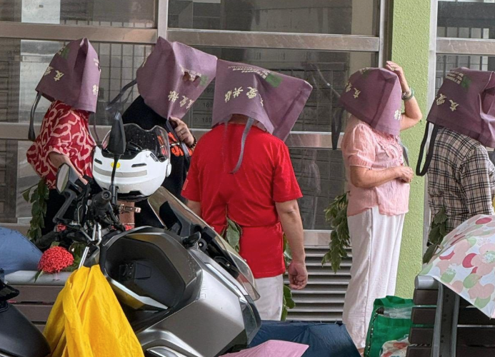 大媽們離奇以環保袋「笠頭」(Threads圖片)