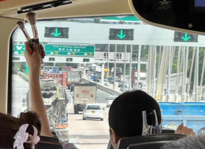 由相片可見,一名在巴士上層、盤起頭髮的女乘客高舉兩支不同大小的化妝掃,靠近頭頂上的冷氣風口,想吹乾化妝掃。即使巴士在行駛時不停晃動,她仍堅持舉起化妝掃,還望一望化妝掃有否對準風口。