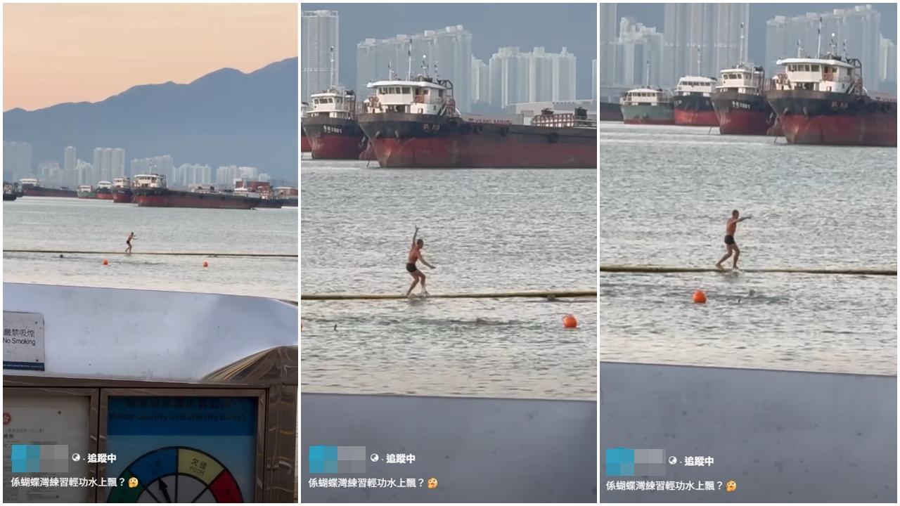有網民在社交平台發文分享,發現屯門蝴蝶灣有男子在防鯊網上慢慢行走,網民笑言,「係蝴蝶灣練習輕功水上飄?」。(屯門友Facebook)