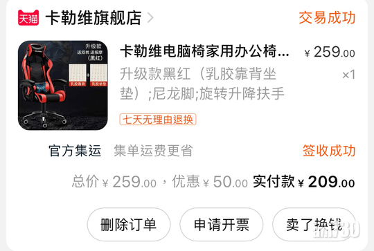 網民指自己一年前在淘寳網店舖「卡勒維旗艦店」,以209人民幣(約250港元)購入一張黑紅色的升級版電腦椅。(網上圖片)
