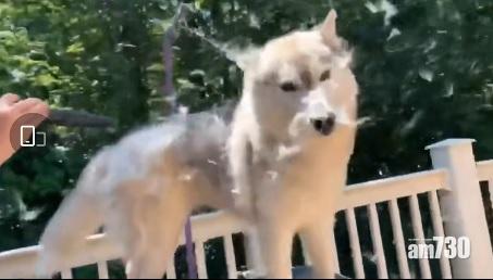 飼主以吹風機對準狗仔,狗狗身上白毛如雪片飄。