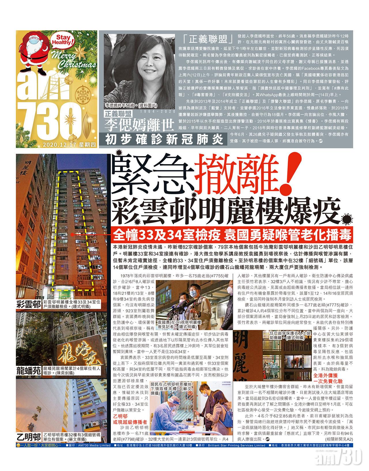本港新冠肺炎疫情未遏,昨新增82宗確診個案,79宗本地個案包括牛池灣彩雲邨明麗樓和沙田乙明邨明恩樓住戶。明麗樓33室和34室接連有確診,港大微生物學系講座教授袁國勇到場視察後,估計傳播與喉管滲漏有關,但暫未肯定確實途徑,全幢的33、34室住戶須撤離檢疫。至於明恩樓的個案集中在32樓「細號碼」單位,該層14個單位住戶須檢疫,連同昨增至4個單位確診的鑽石山龍蟠苑龍珊閣,兩大廈住戶要強制檢測。