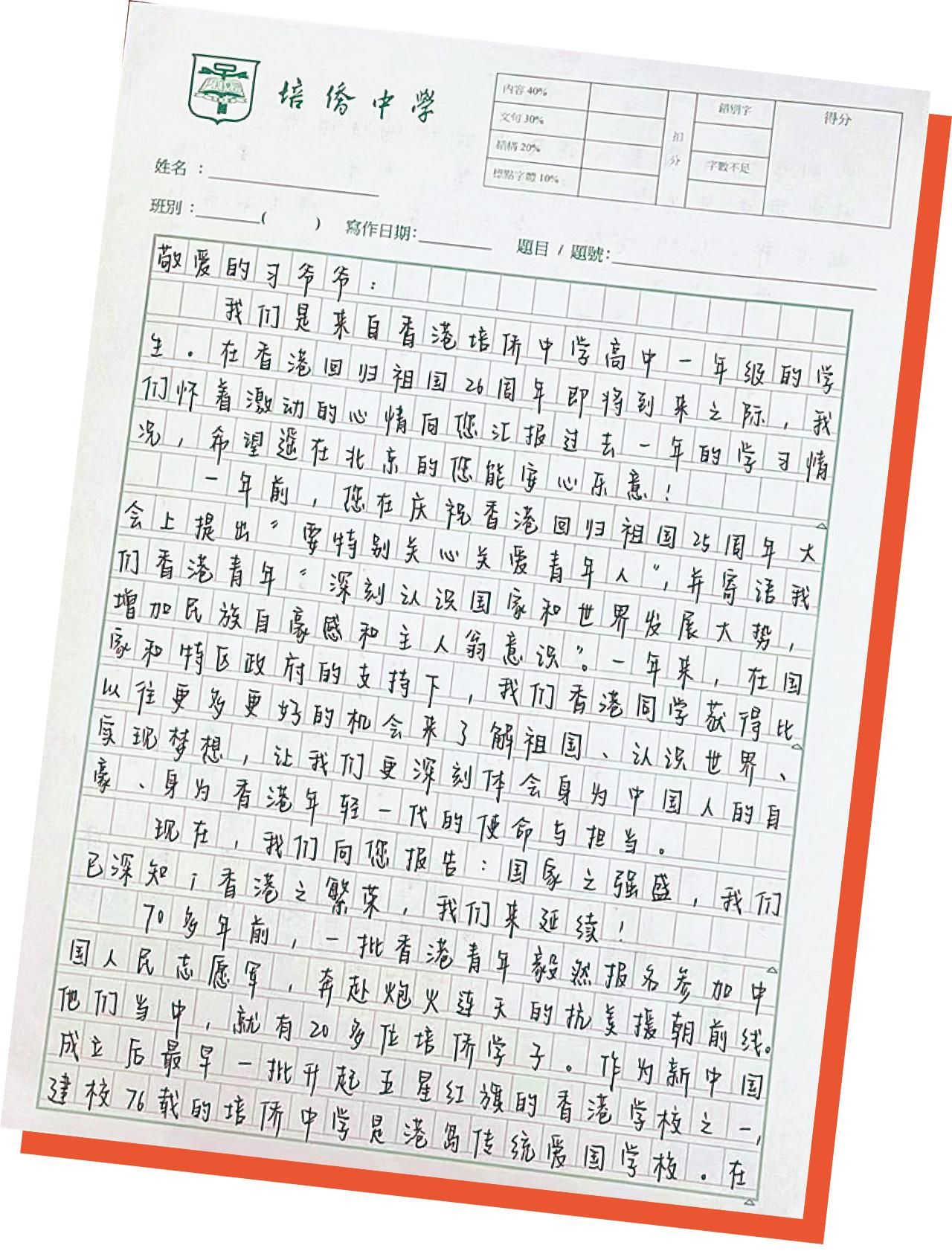 培僑中學校長伍煥杰向本報表示,校方在習近平來港視察後,切實地實踐了愛國主義教育課程,當時藉他訪港一周年作出匯報。他指學生對習主席的回信感到十分興奮,感謝習主席在百忙之中抽空回信。參與寫信的學生代表表示,會努力增長才幹,成為立足香港、胸懷祖國並擁有國際視野的新時代青年。