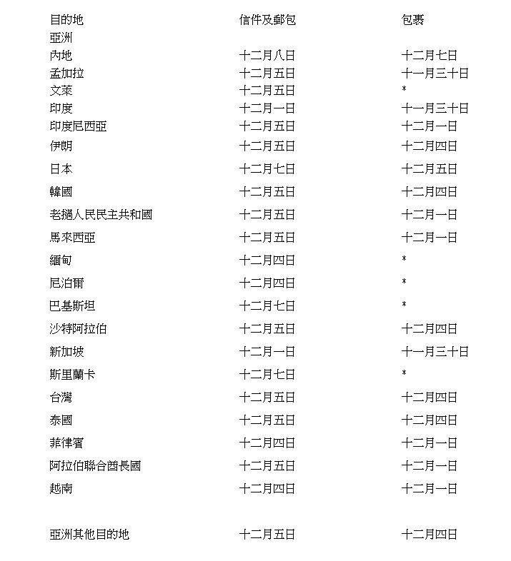 香港郵政今日(1日)宣佈今年的聖誕空郵截郵日期,而有關日期是根據各目的地郵政機關的要求而臨時訂定作為參考資訊,確實日期及服務或會受當時的空運服務所影響,並可能會於短時間通知後予以更改。