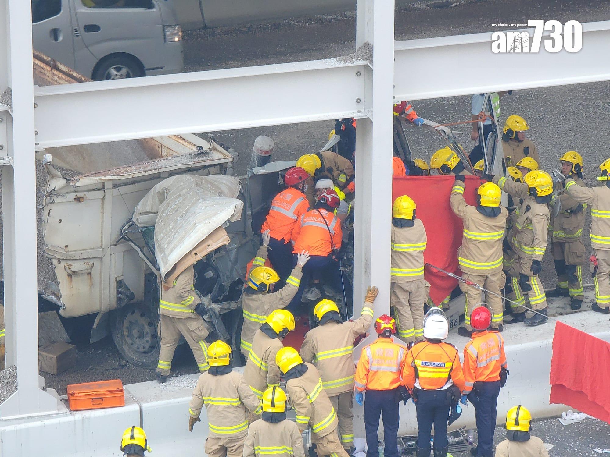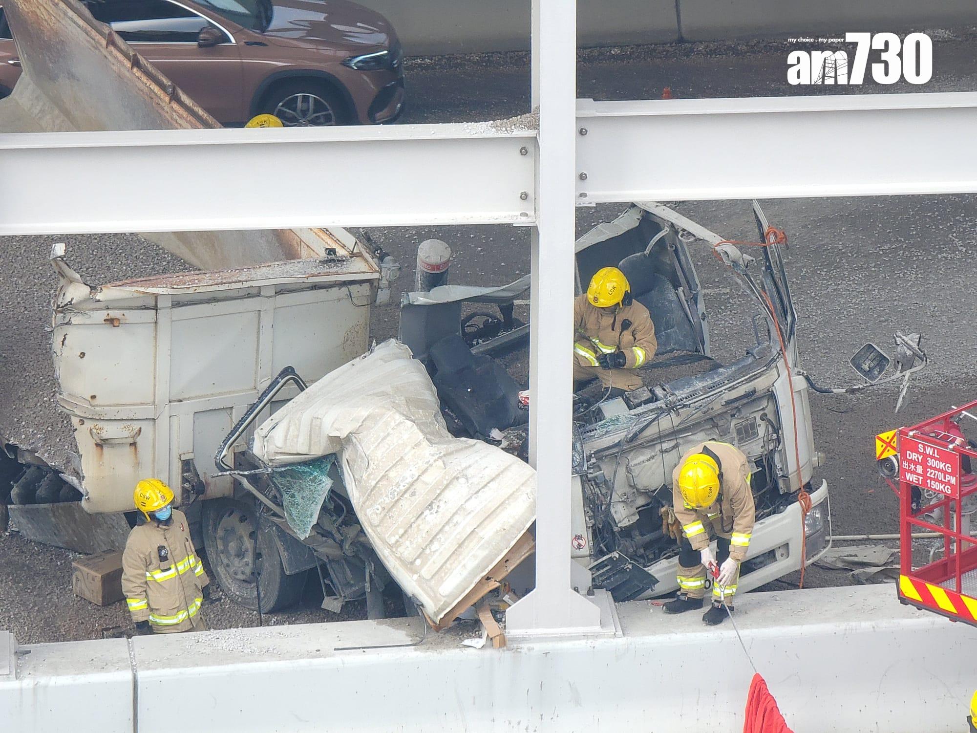 今日(3日)早上8時許,荔枝角青沙公路天橋往沙田方向、近荔枝角懲教署位置,一輛泥頭車與一輛法拉利相撞,泥頭車繼而失撞撞石壆,車頭嚴重毀爛,司機被困。
