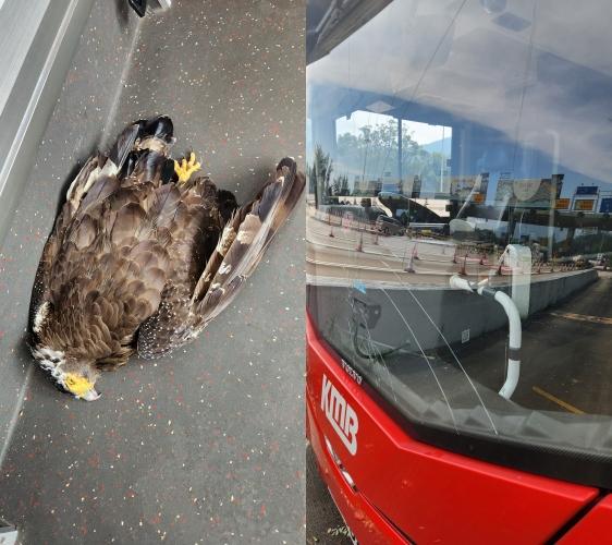 一輛九巴於大欖隧道收費亭前撞斃一隻蛇鵰!