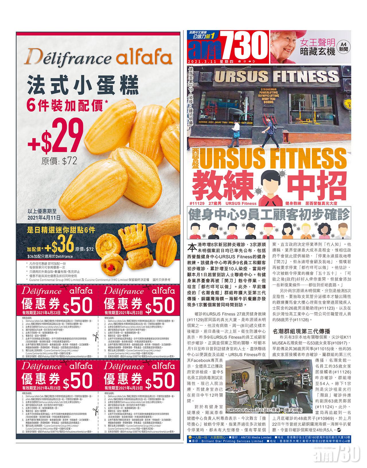 確診的URSUS Fitness 27歲男健身教練(#11129)居同區的真光大廈,是昨源頭未明個案之一,他沒有病徵,周一(8日)遞交樣本後確診,前日最後一次上班。衛生防護中心表示,昨多9名URSUS Fitness的員工或顧客初步確診,正調查個案之間的關聯,呼籲本月1日至昨日曾到訪健身室的人士,盡快聯絡中心以便調查及追蹤。URSUS Fitness昨在其Facebook專頁表示,全體員工已獲政府安排檢疫,當中5名員工因病毒測試呈陽性,現已入院治療,而健身室亦已在前日中午12時關閉。