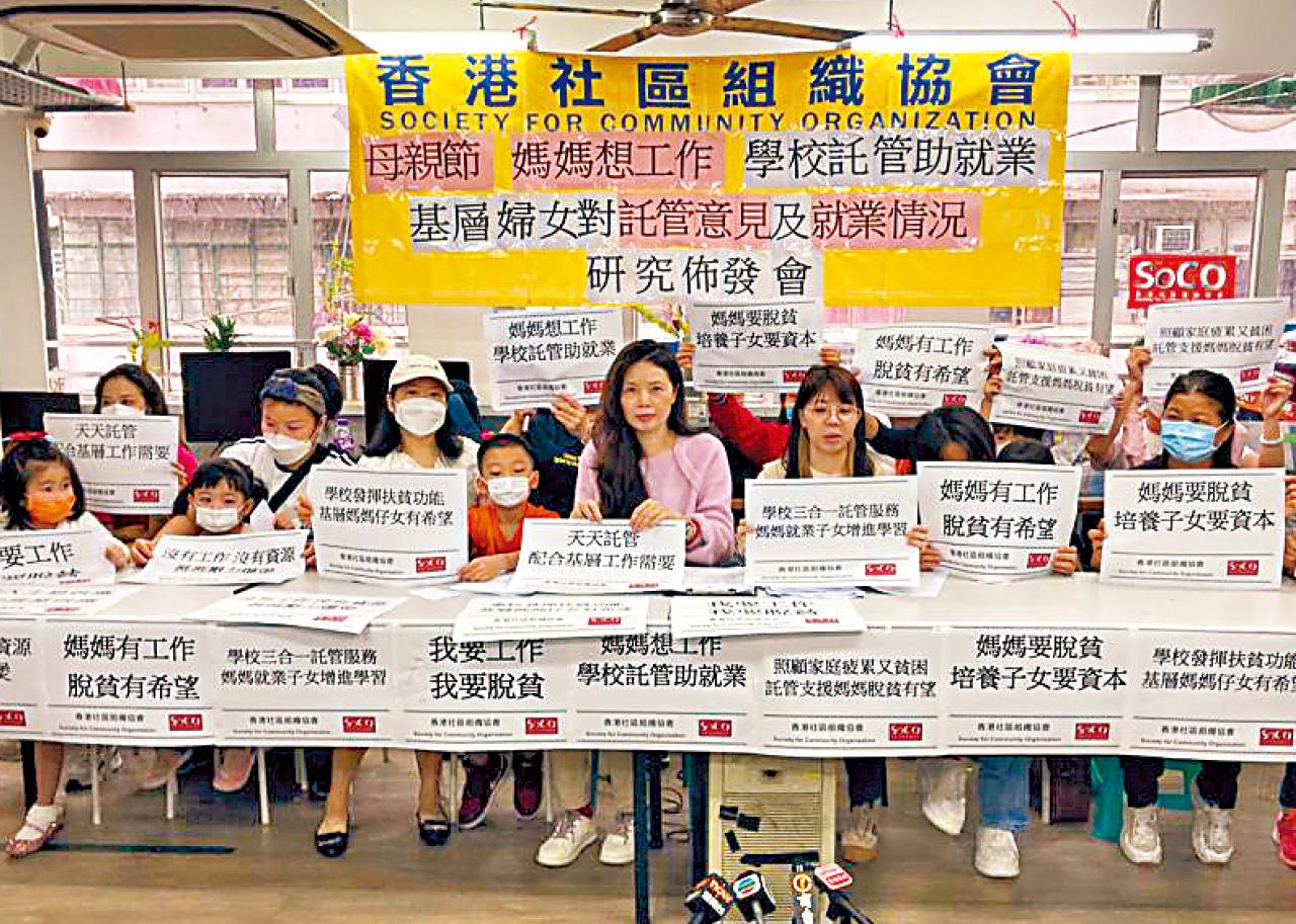 一批基層母親因要照顧子女不能外工作,生活拮据。社會組織協會本月3至10日透過組織屬下服務等基層住戶群組派發網上問卷,成功訪問育有子女的208名基層婦女,其中72.1%為家庭主婦。94.2%受訪基層婦女不能工作的原因,主因是因要照顧子女,但本港托兒服務發展不足,學校沒有提供課餘託管(44.2%)、託管服務昂貴未能負擔(36.5%)、資助託管名額很少(24.9%)、託管機構未能提供由學校到中心的接送服務(20.8%)等,故托兒服務不完善亦阻礙了婦女出外工作。